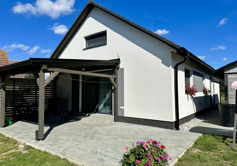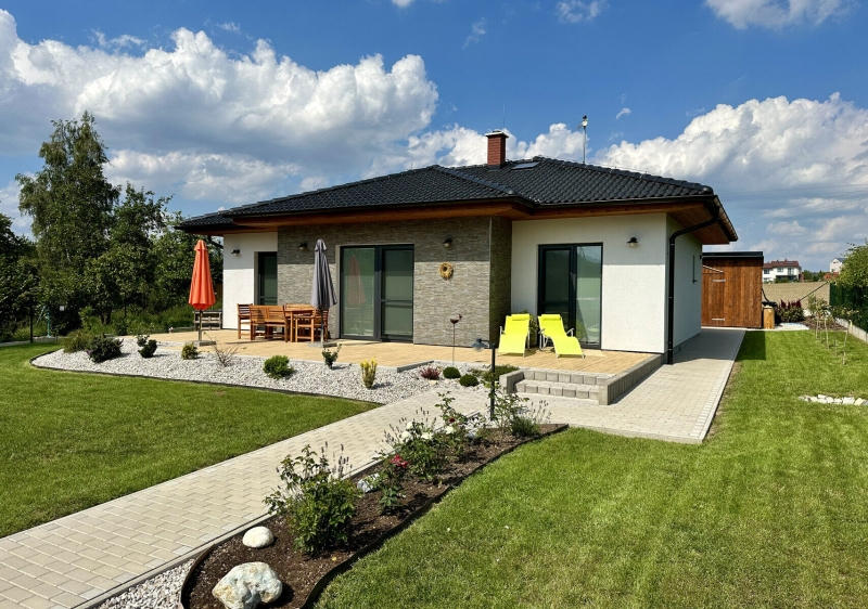 Přízemní rodinný dům, který uliční fasádou harmonicky splývá s tradiční venkovskou zástavbou, avšak na druhou stranu je svou soukromou částí plně otevřen do zahrady. Veškeré výhledy z obytných místností jsou orientovány na jednu světovou stranu, díky tomu je zaručeno maximální soukromí domu i v hustěji zastavěných oblastech.